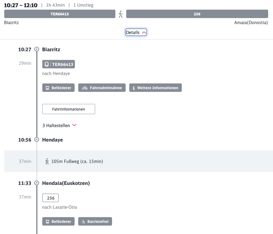 One of those places was Irun-Hendaia at the France-Spain border. The Euskotren service crosses the border every half an hour there, but until now you had to know it existed – the timetables for it were nowhere to be found in international timetable searches like DB and ÖBB Scotty (the Swiss SBB timetable people were so annoyed they’d found a temporary work around).