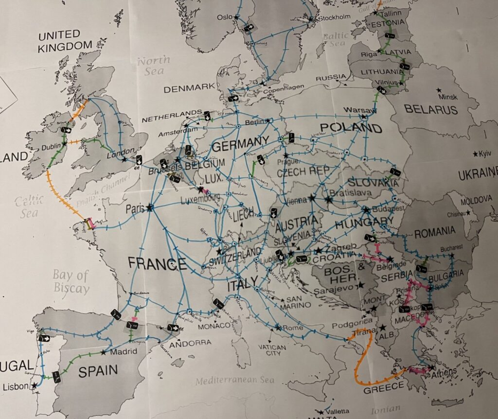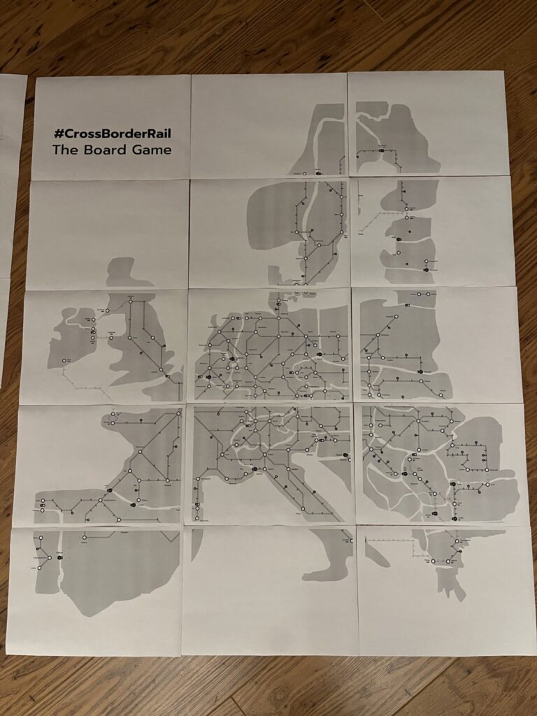 In mid December 2023 I was working on a documentary with a Dutch film crew and the producer asked me “Jon, did you ever think of making a board game to explain the problems with international rail in Europe?” I had not ever thought of that, but then my mind started to work, and I started to design boards… and so now there is a prototype of a #CrossBorderRail board game. The idea is to explain the problems of international rail in Europe from a passenger point of view – and make it fun as well.