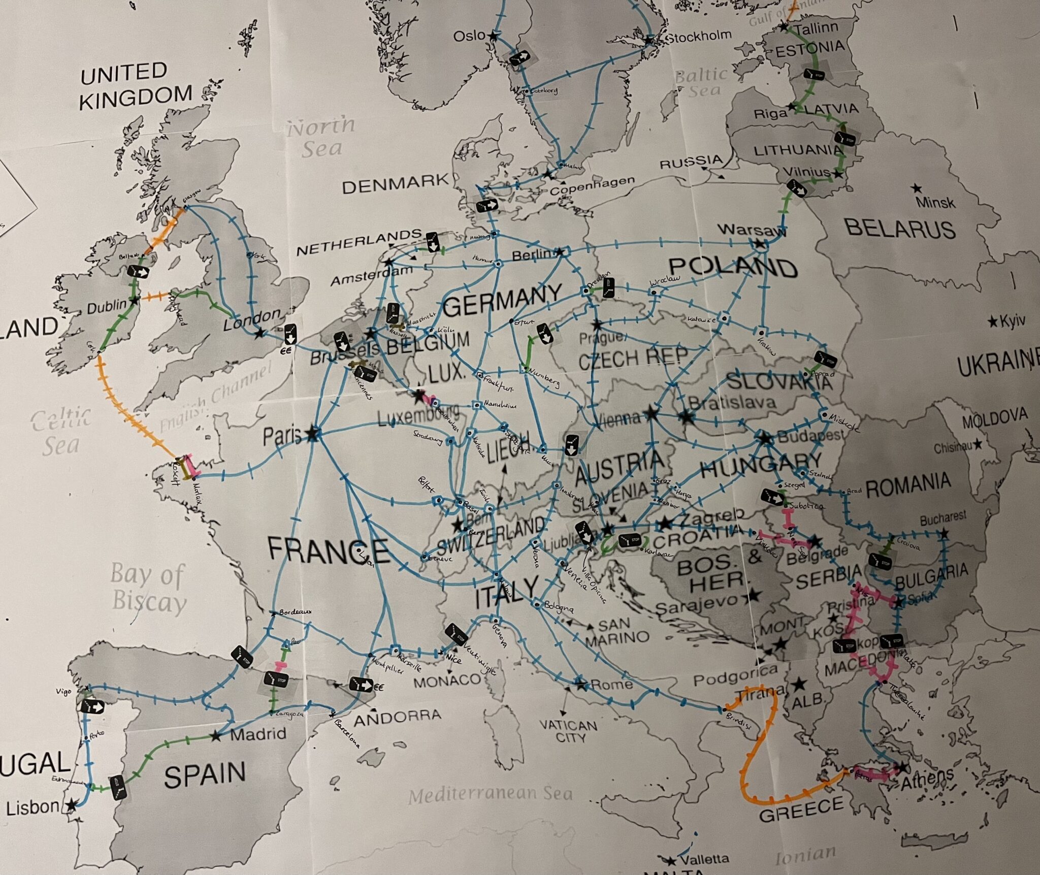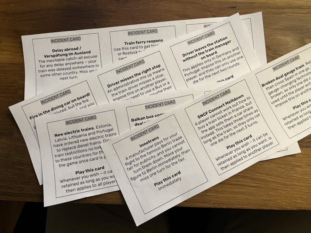 Files are currently version 1.2.0, correct as of 3 January 2024. Some errors were found in both the map and incident cards in V 1.1.0 and have been corrected. More work has been done to prevent players getting stuck in corners of the board – more ferry routes, and some additional trains in the Baltic states have been added to overcome these issues. More A icons have also been added to the board. Rules have been adjusted regarding how extra Action Cards can be drawn by players.
