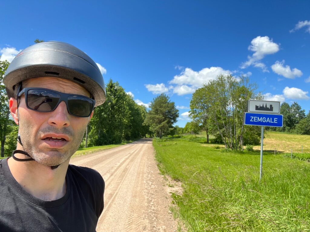Jon mit einem Fahrradhelm, nachdem er auf einer unbefestigten Straße in Richtung Turmantas geradelt ist – Jon with a bike helmet, having cycled a dirt road towards Turmantas