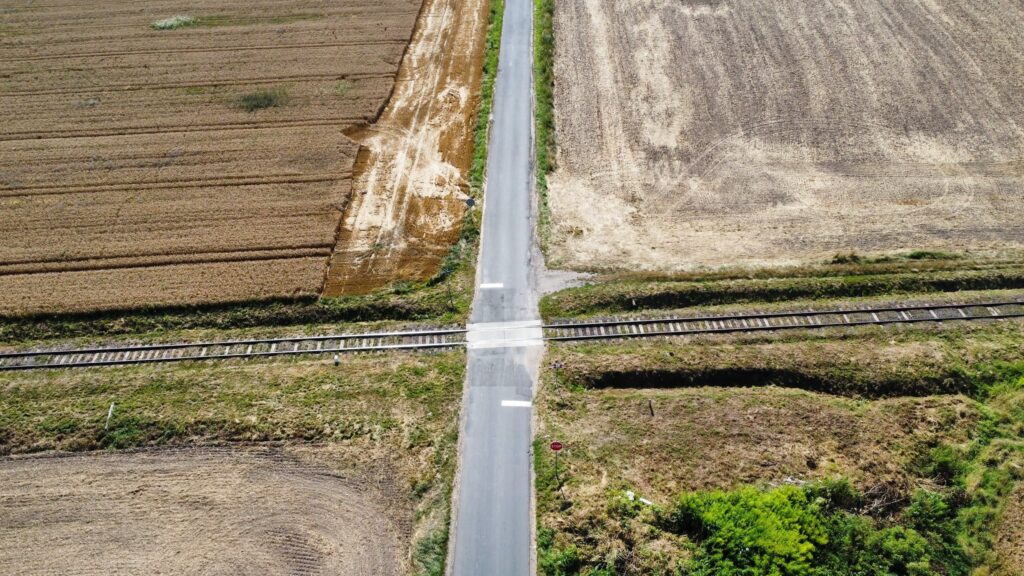 Schlechte Gleisqualität und ein Bahnübergang ohne Schranken in Porajów, Polen – Poor quality track and a level crossing without barriers at Porajów, Poland