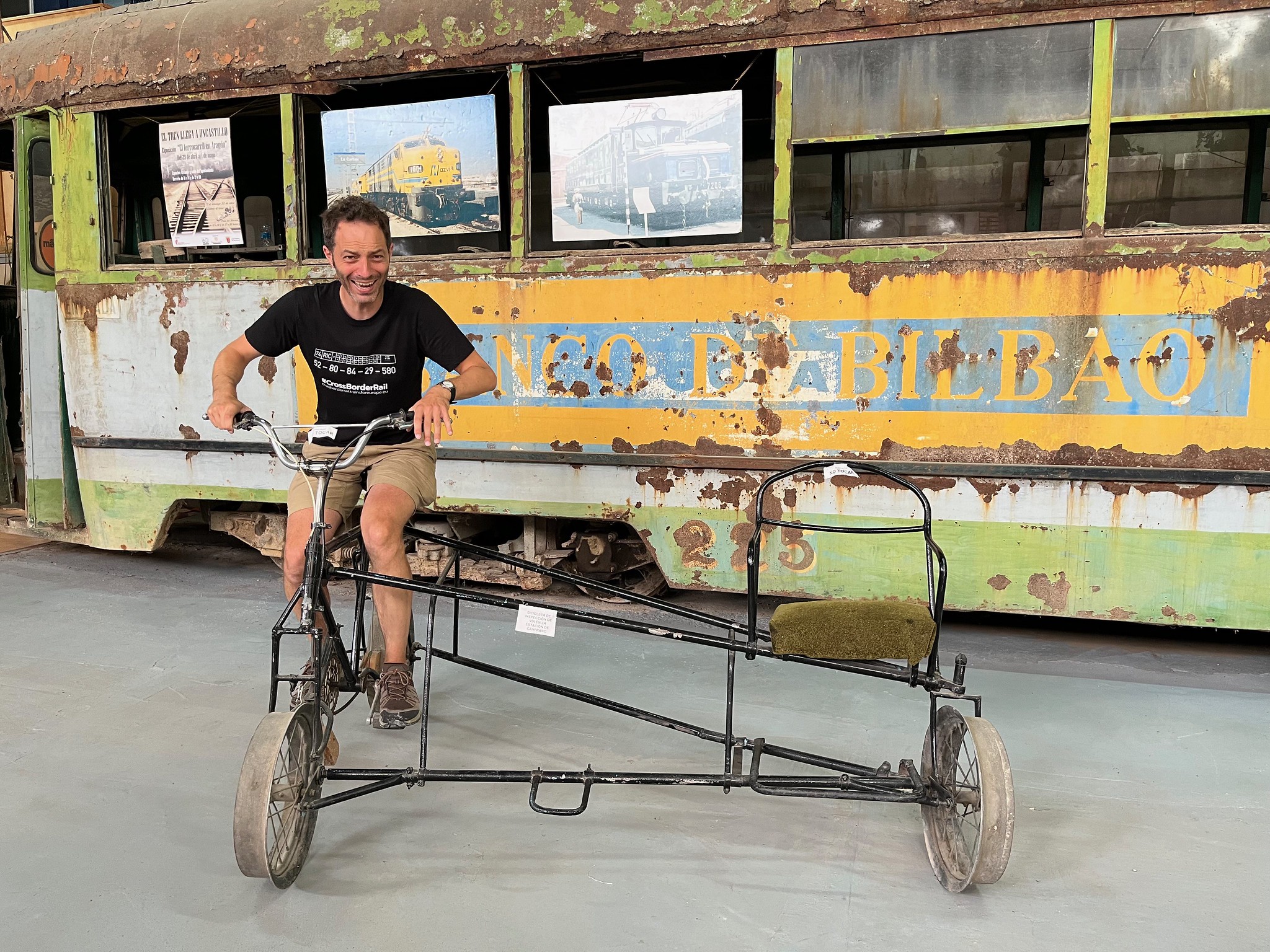 Jon auf einer Art Draisine im Eisenbahnmuseum von Zaragoza – Jon on a kind of draisine at the Zaragoza railway museum