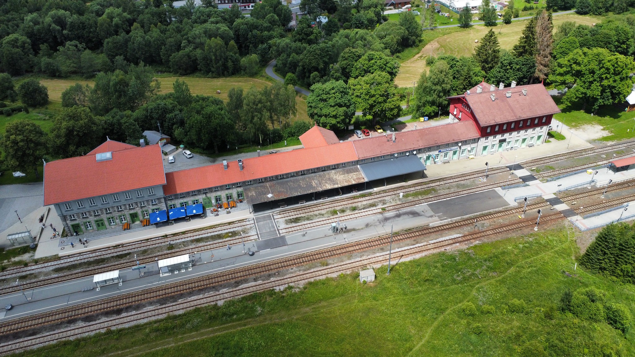 Bahnhof Bayerisch Eisenstein, wo links vom Gebäude Deutschland und rechts Tschechien liegt – Railway station Bayerisch Eisenstein, where the left of the building is Germany and the right is Czechia