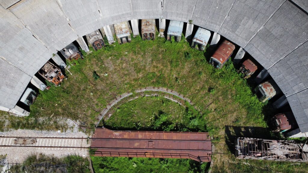 Rundlokschuppen und Drehscheibe mit alten Lokomotiven in Canfranc – Roundhouse and turntable with derelict locomotives at Canfranc