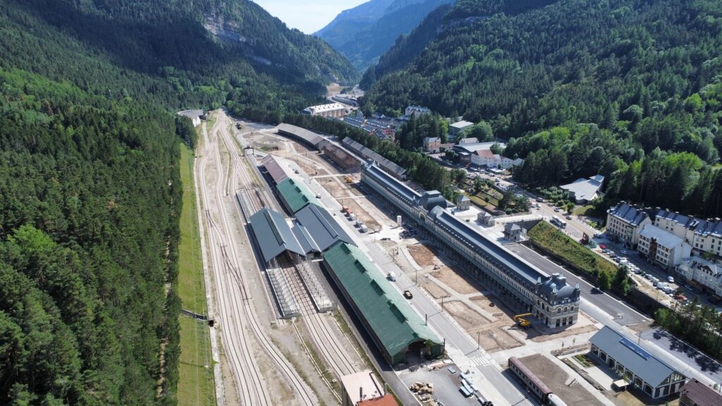 Bahnhof Canfranc. Das große Gebäude rechts ist jetzt ein Hotel, und der eigentliche Bahnhof ist der ehemalige Güterbahnhof – Canfranc station. The large building to the right is now a hotel, and the actual station in the former goods buildings to the left