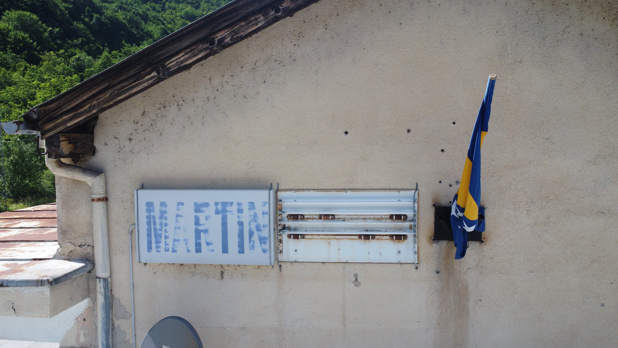 Halb kaputtes Bahnhofsschild in Martin Brod, mit einer bosnischen Flagge – Half broken station sign at Martin Brod, with a Bosnian flag