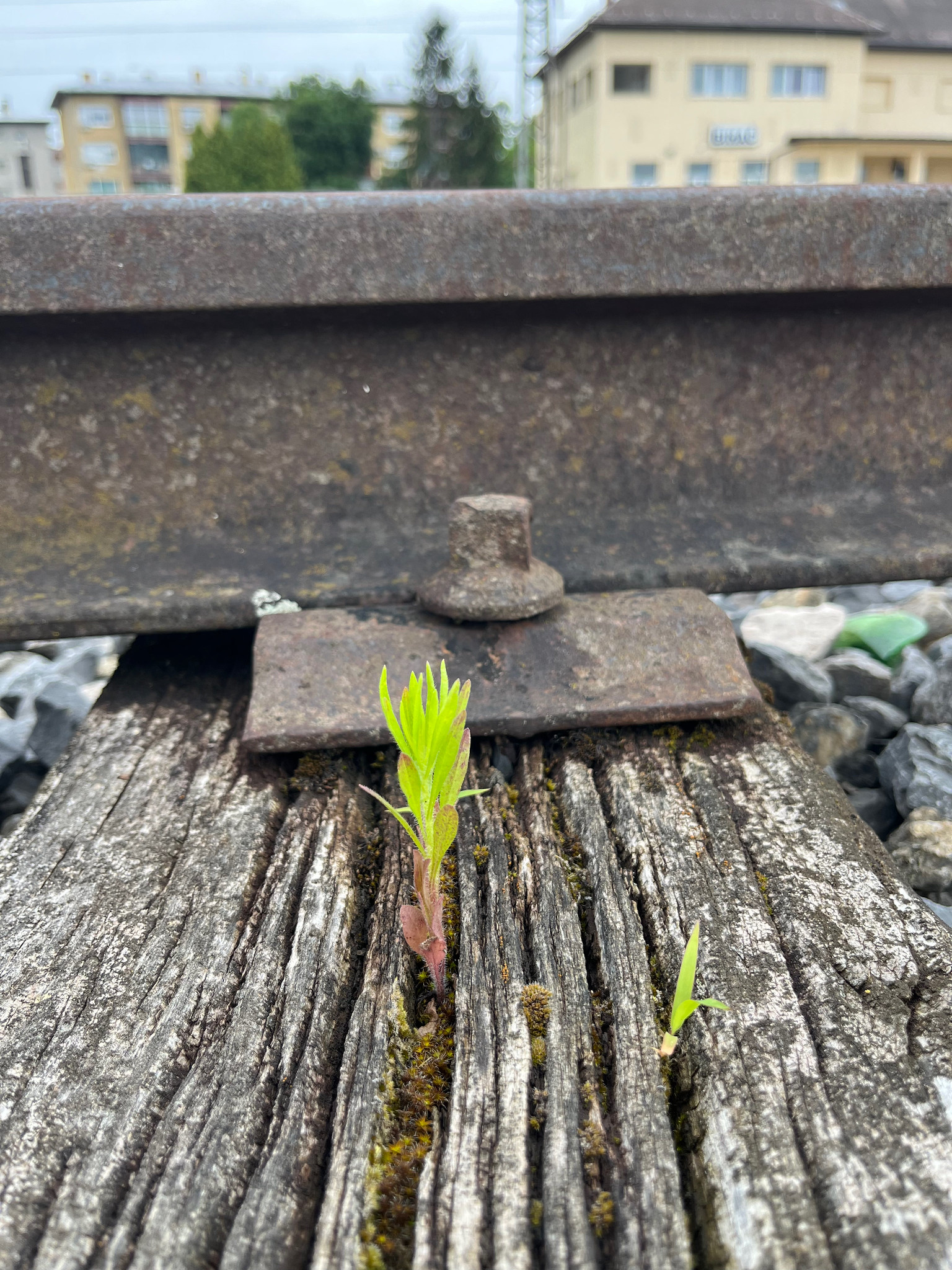 Eine Pflanze wächst durch einen Riss in einer Schwelle in Bihać, Bosnien – A plant shoots through a crack in a sleeper at Bihać, Bosnia