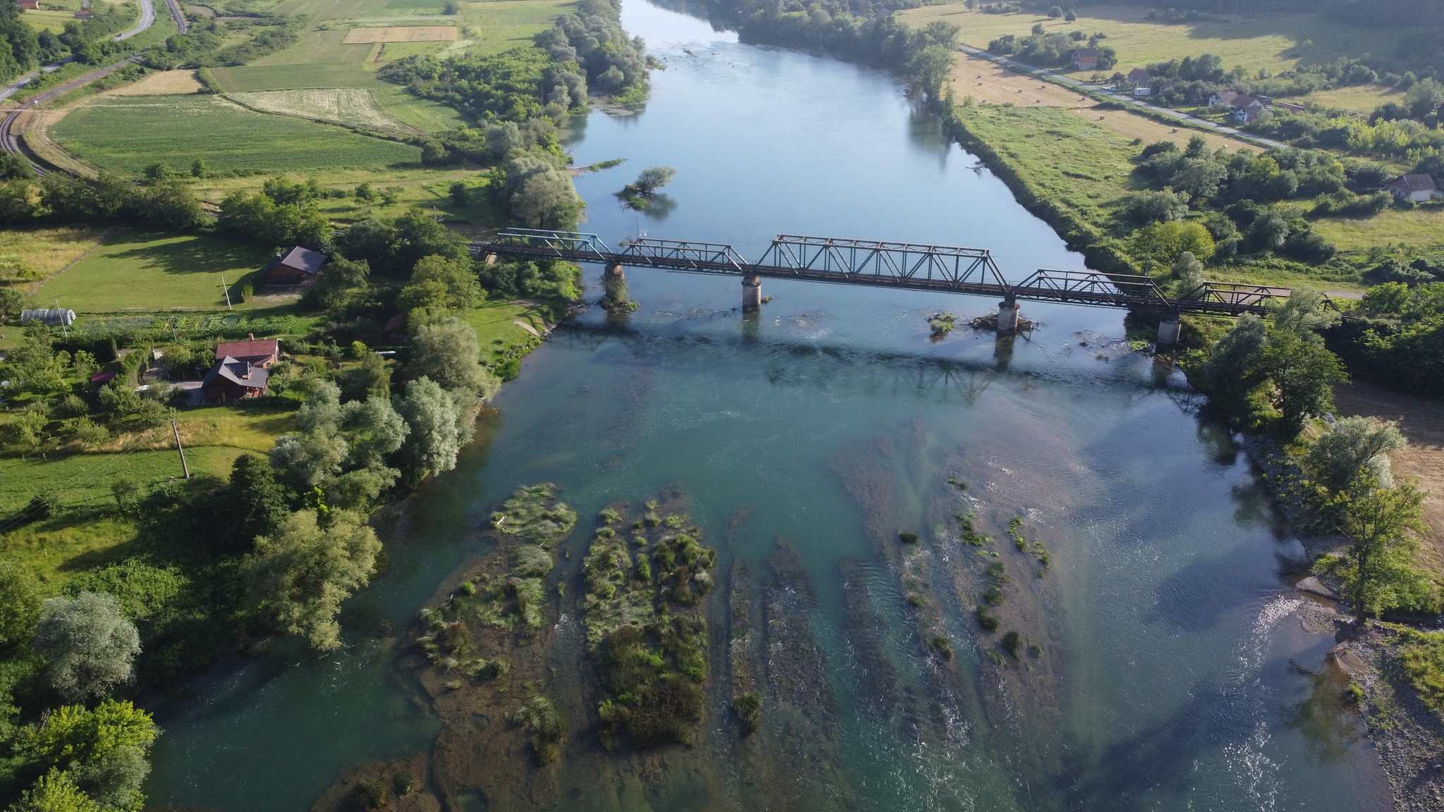 Brücke über den Fluss Una, südlich von Bihać, Bosnien. Links ist Bosnien, rechts ist Kroatien – Bridge over the Una river, south of Bihać, Bosnia. Bosnia to the left, Croatia to the right