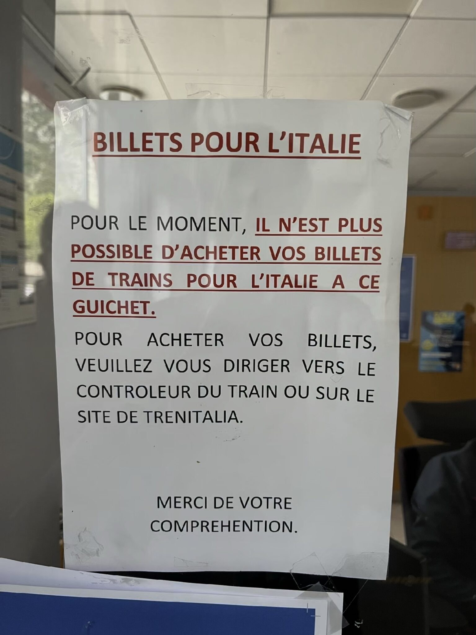 Schild am Fahrkartenschalter: Fahrkarten nach Italien in Breil s/ Roya nicht verkauft werdenFrench train in Breil s/ Roya – Sign at the ticket office saying tickets to Italy are not for sale at Breil s/ Roya