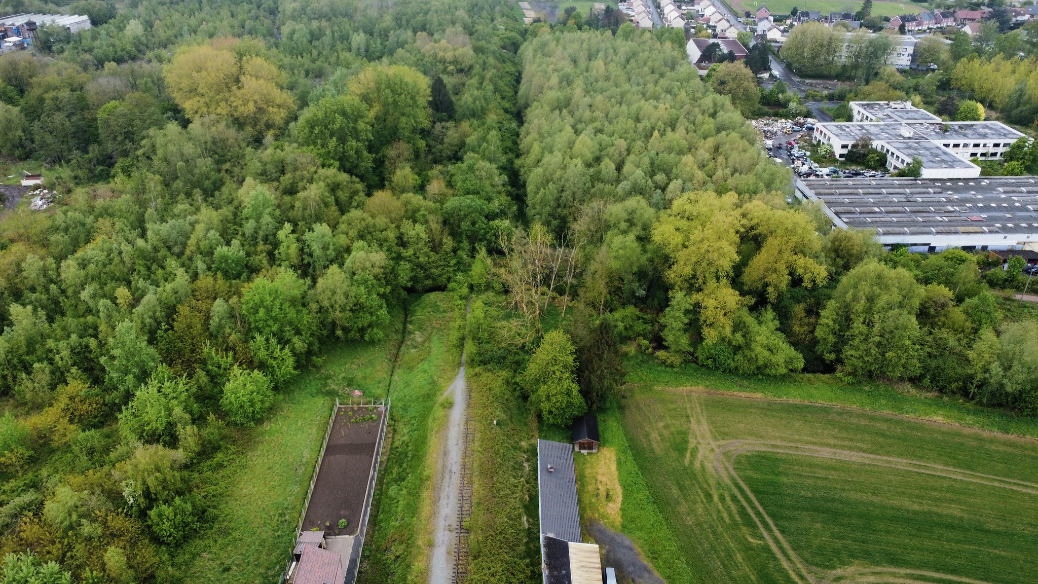 Drohnenfoto von der Grenze zwischen Quiévrain und Crespin. Das Bild zeigt den Blick von Belgien nach Frankreich, die Grenze ist dort, wo die dichtesten Bäume anfangen – Drone pic of the border between Quiévrain and Crespin. Picture looks from Belgium to France, the border is where the densest trees start