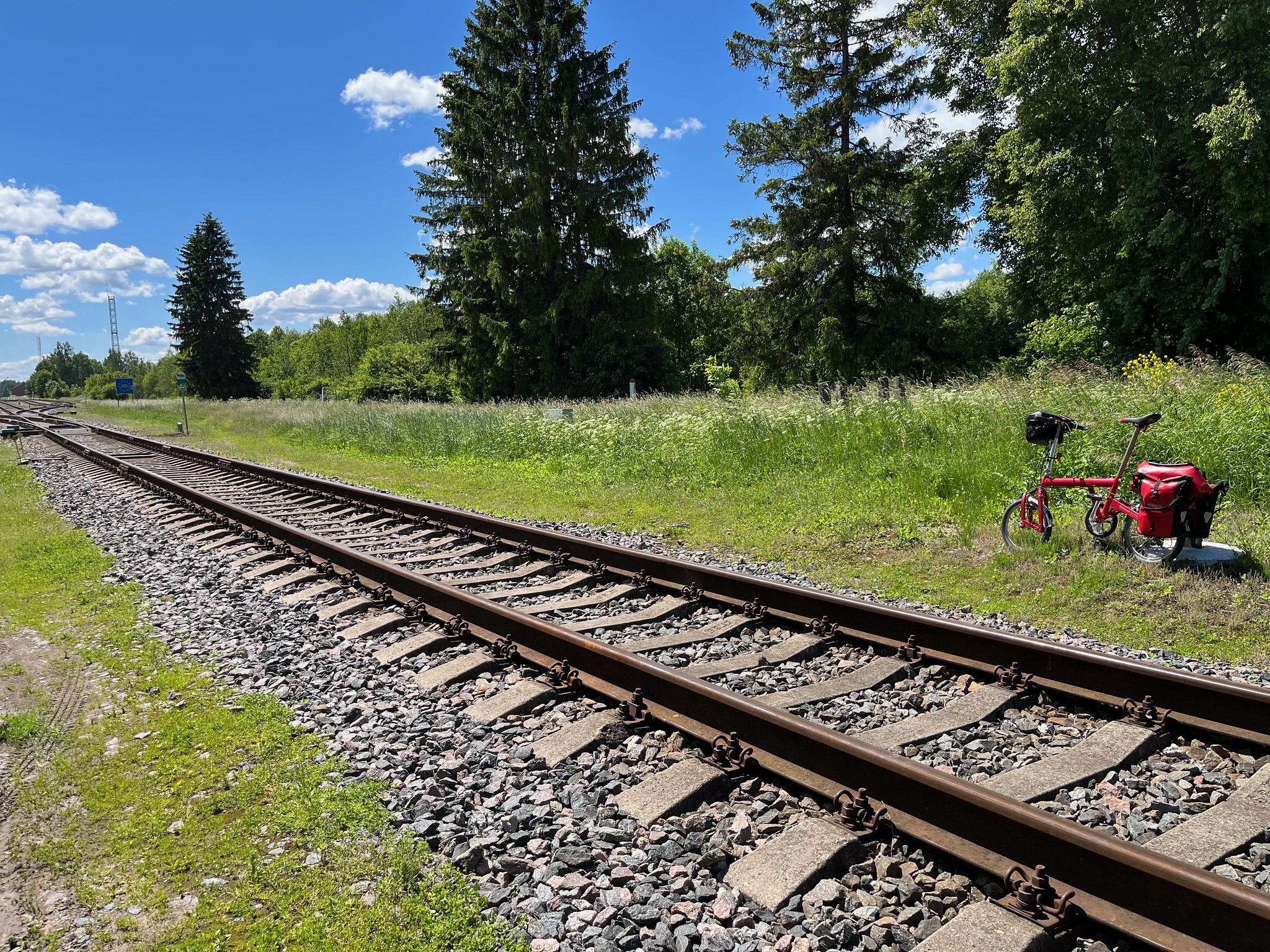 Aktive Eisenbahnstrecke und Birdy-Fahrrad an der Grenze bei Turmantas – Active railway track and Birdy bike at the border at Turmantas