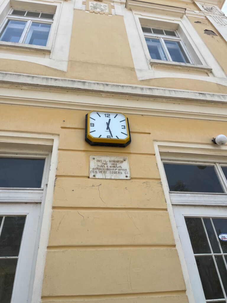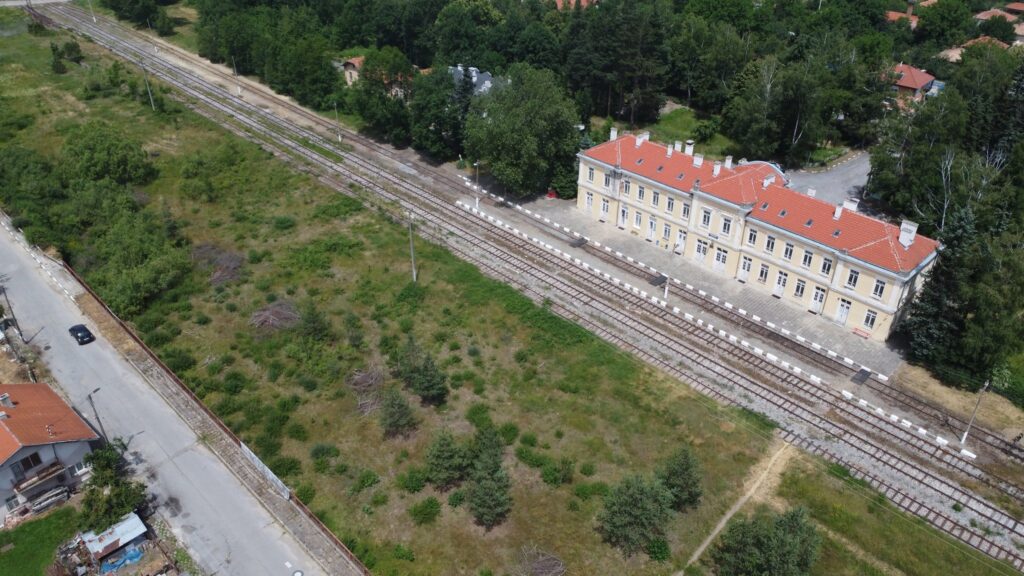 Gedenktafel in Gyushevo, die an den Bau der Strecke auf bulgarischer Seite in den Jahren 1912–1913 erinnert – Plaque at Gyushevo commemorating the building of the line Bulgarian side in 1912-1913