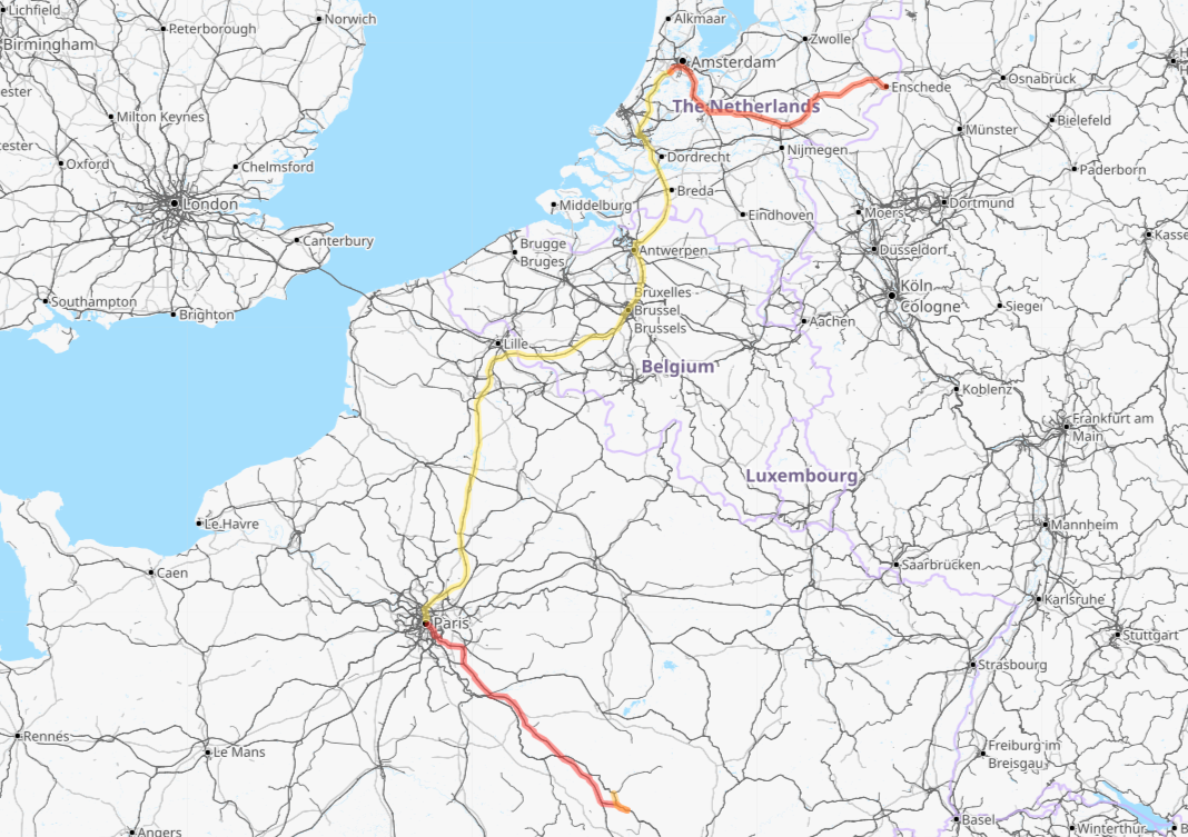 This is an extra #CrossBorderRail day – to go to Enschede in Netherlands to film part of a documentary with a Dutch film crew. We will film at Enschede station, where the German and the Dutch networks are separated by a physical barrier. The trip to Enschede is rather uninspiring – a Thalys between Paris and Schiphol Airport crosses both the FR-BE and BE-NL borders at high speed. Both of these borders I have crossed before. You can see these borders on my All The Borders map.