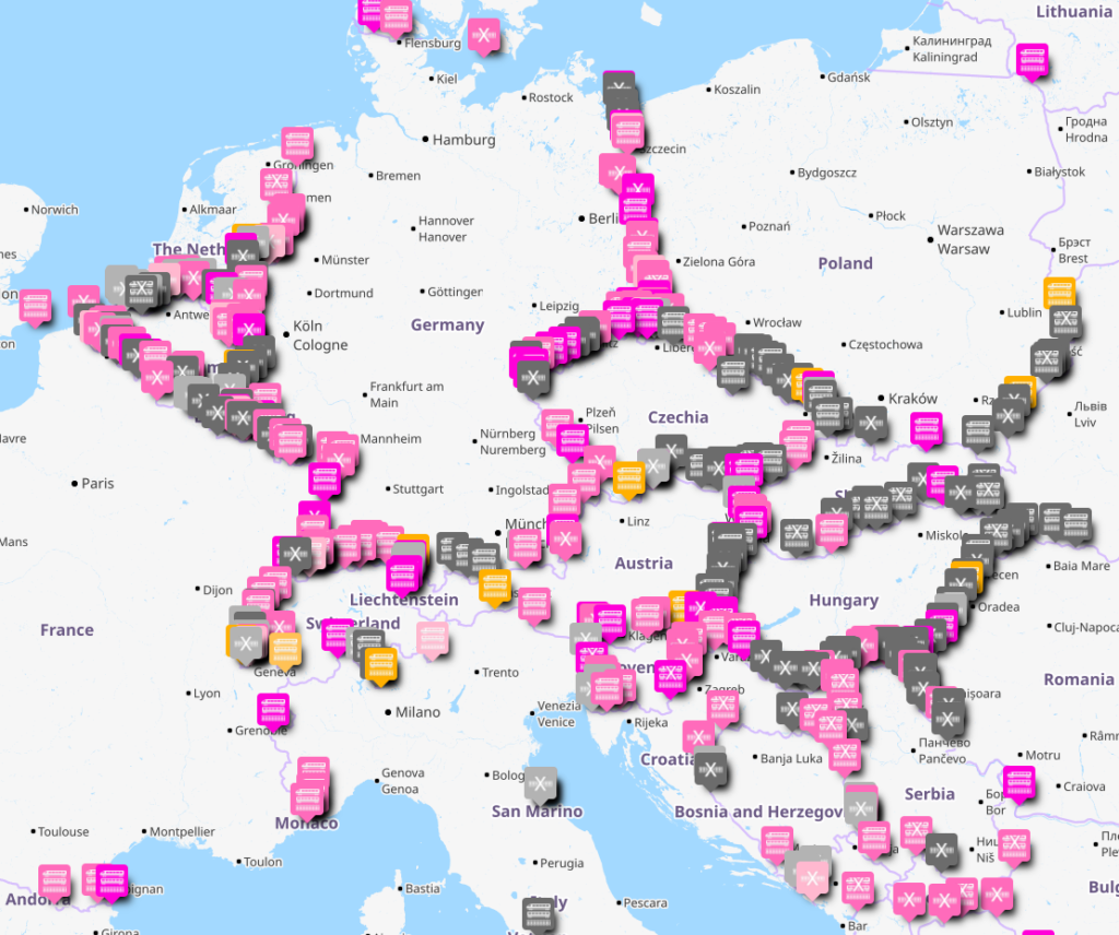 The map is part for my own purposes, and has a more general use as well. Pink pins on the map indicate border lines I have been as part of the #CrossBorderRail project, yellow pins are places I have been sometime before, and grey are places I have not been.
