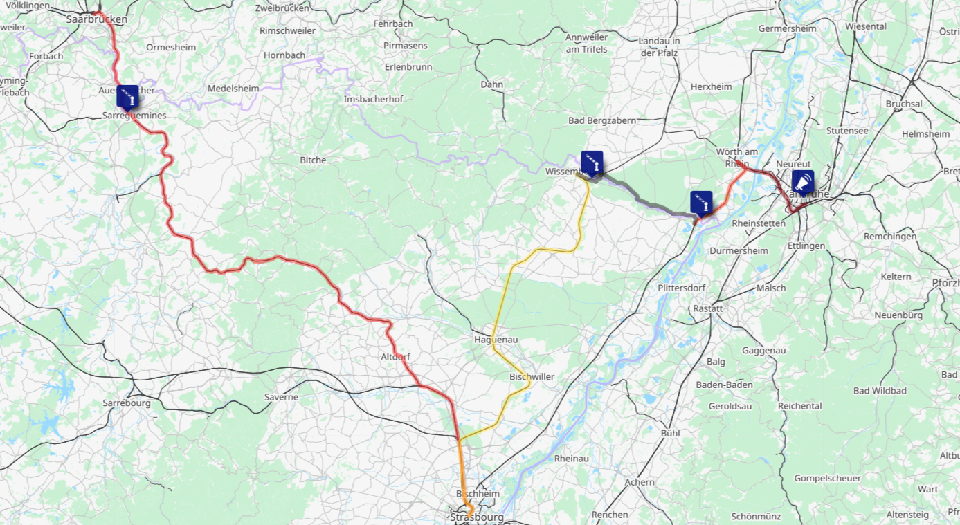 There has been a lot of political attention to railway connections between France and Germany in the past 12 months – with Freiburg-Colmar attracting most attention. But I have long wanted to get a more complete picture, and this is the day I am going to do it – to travel to the three cross border lines between France and Germany I have not yet travelled. Saarbrücken (DE) – Sarreguemines (FR) is served by a cross border tram train as well as by an irregular regional train, while there are regional services (albeit on quite poor infrastructure) at both Wissembourg and Lauterbourg. There is the danger that some of the routes here are going to have to change at the last minute due to train driver shortages in Grand Est (some trains seem to be replaced by buses). But one way or another – by train, bus or bike – I am going to get to the borders and finally be able to say I have been to every France-Germany cross border line!