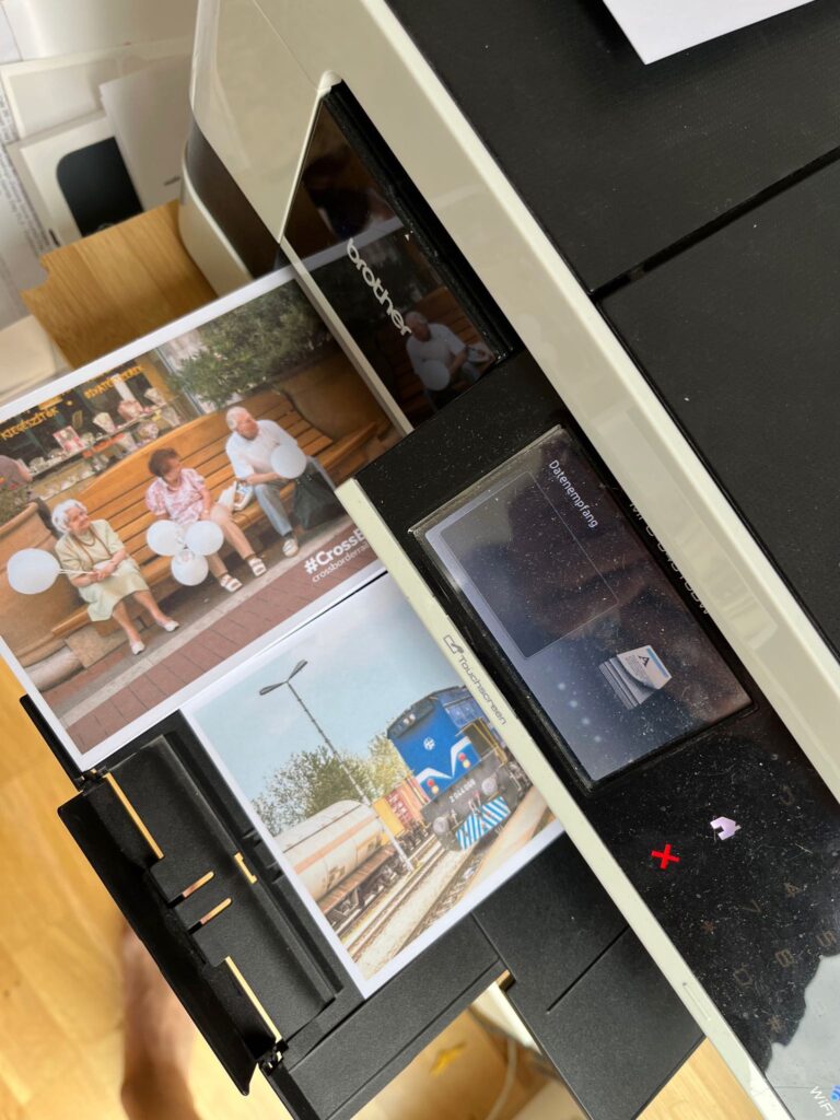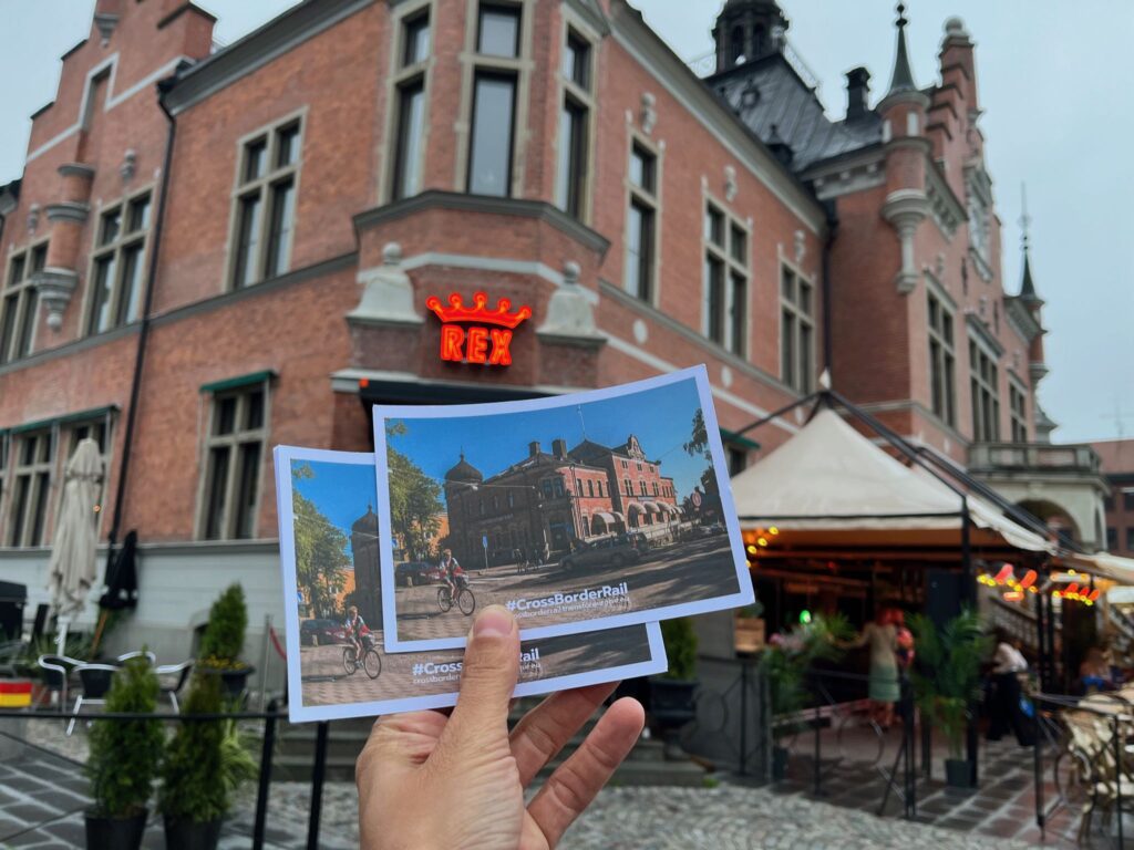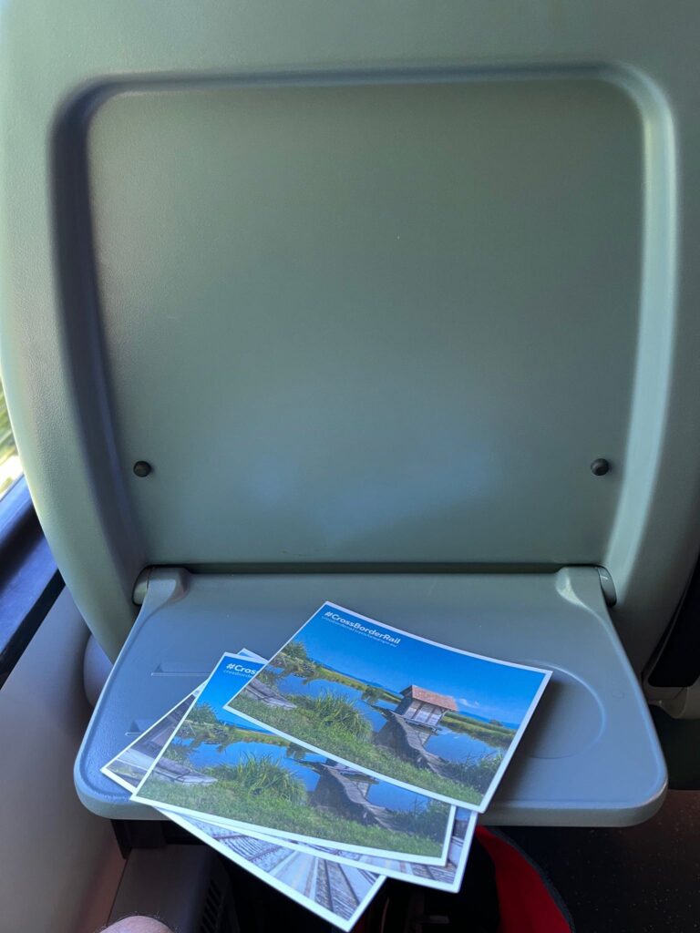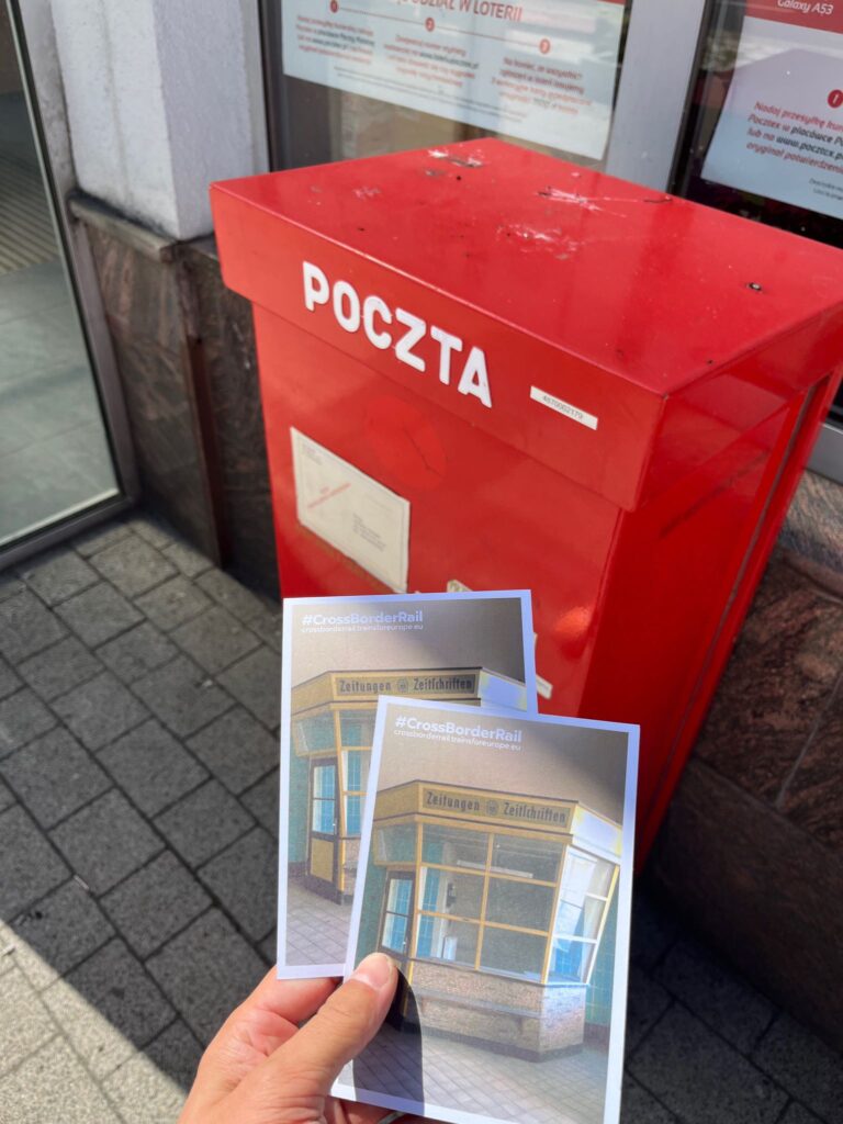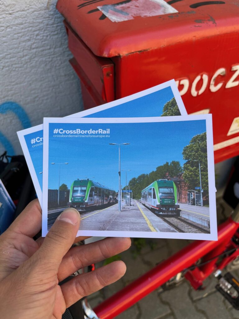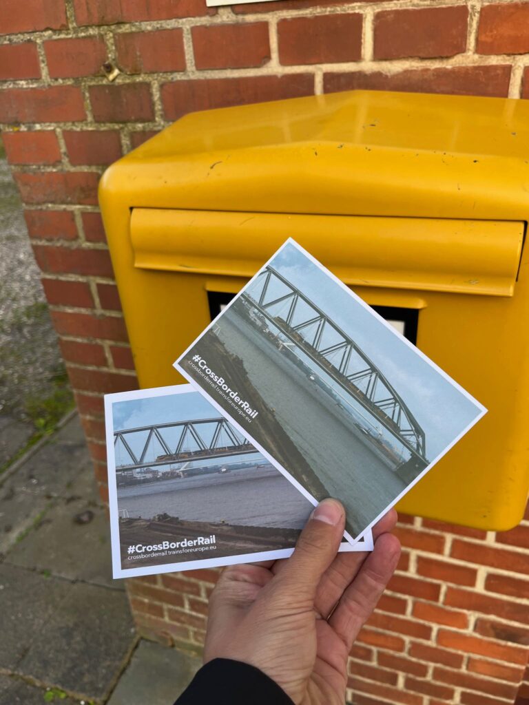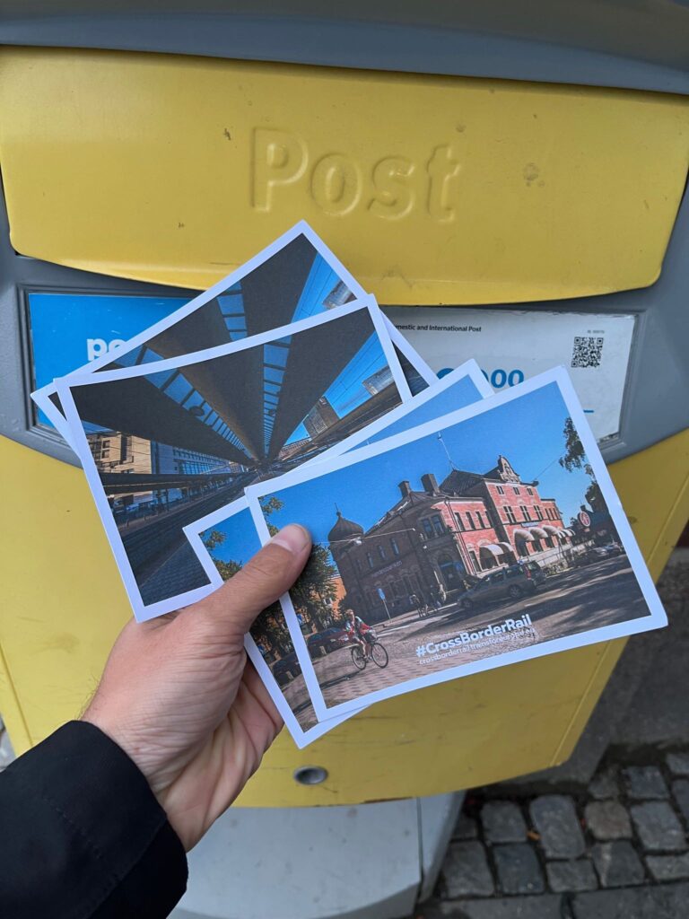Self-printed postcards, 2 for each day of the #CrossBorderRail project, home made and with a photo relevant to the day.